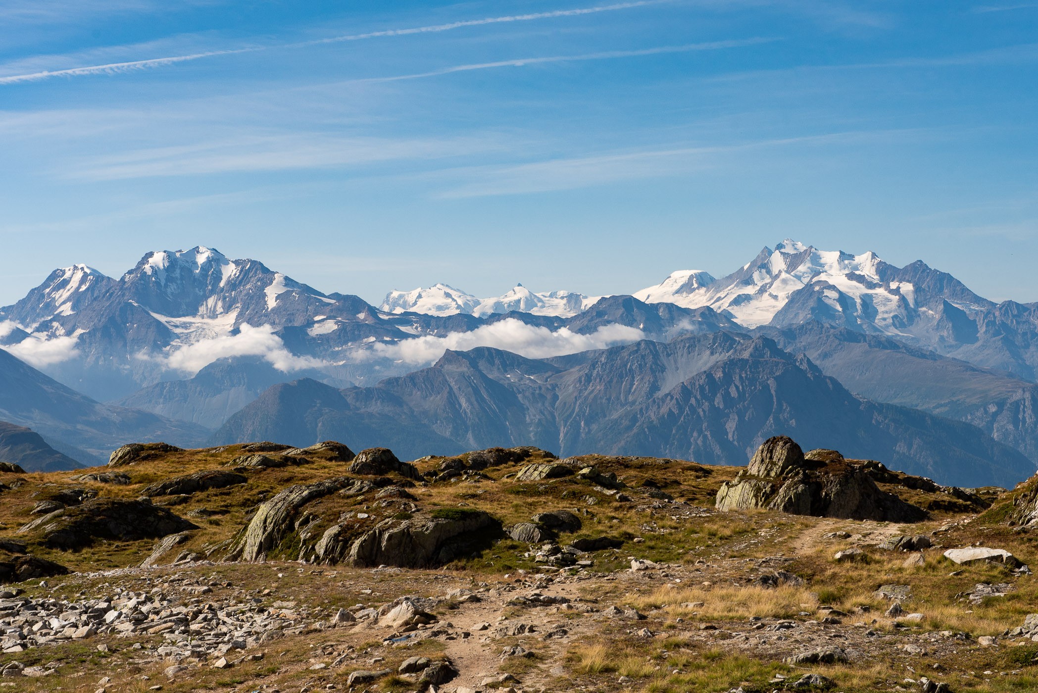 Fotografeer je een berglandschap het beste uit het dal of juist vanaf de top? Dat hangt sterk af van de hoogte van de bergen. In Zwitserland was ik in het kanton Wallis – dat is een soort provincie. Hier was ik omcirkeld door toppen van vaak meer dan vierduizend meter hoog. Maar in het dal zag je die niet. Je moet dan echt de berg op om de piek te kunnen zien. Op de top heb je natuurlijk een mooi uitzicht, maar tegelijkertijd is het dal weer ver weg. En soms zie je dan niet eens het dorp in het dal. Meestal fotografeer ik bij hoge bergen ergens ‘halverwege’, maar bij minder hoge pieken sta ik ook graag gewoon op de top.