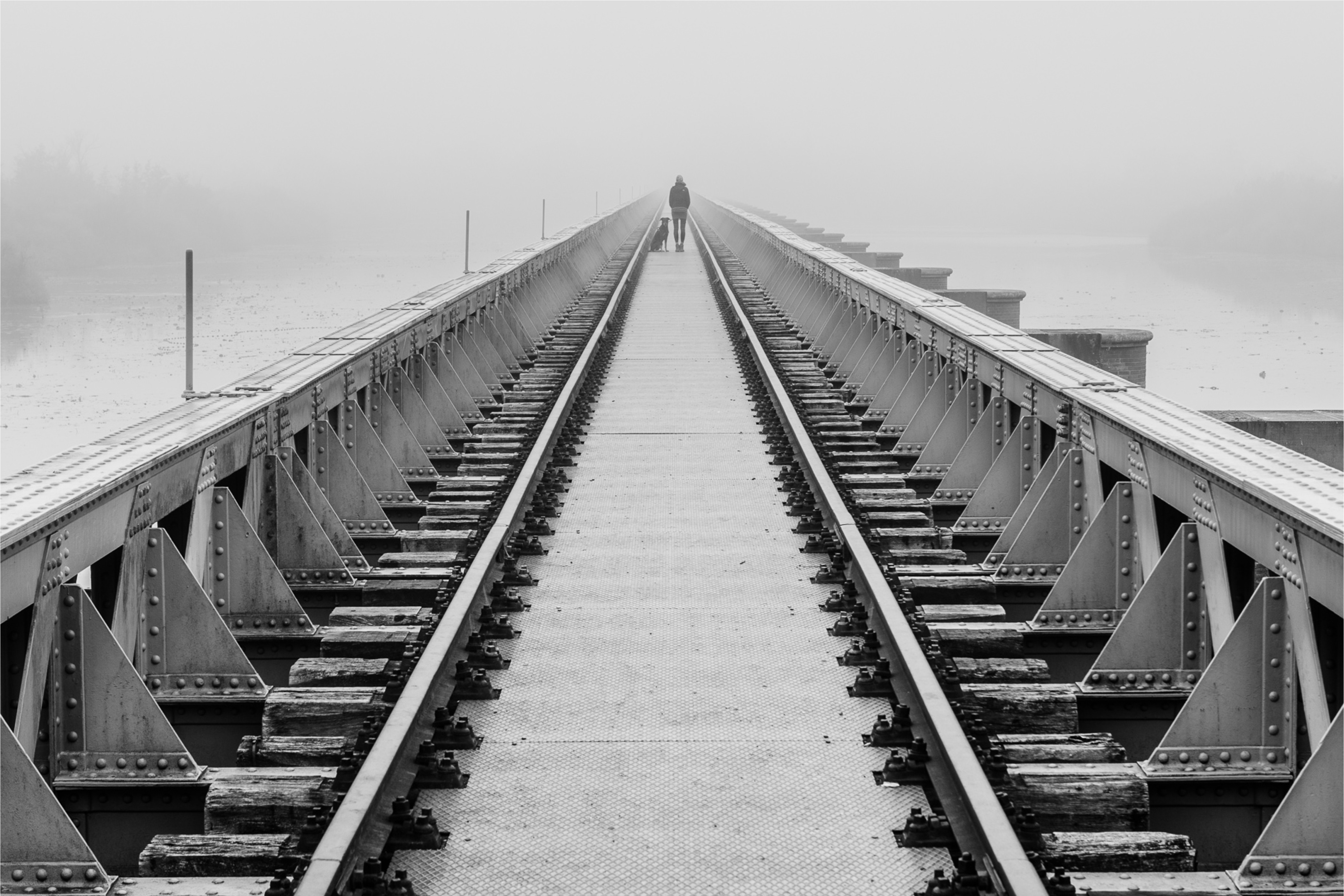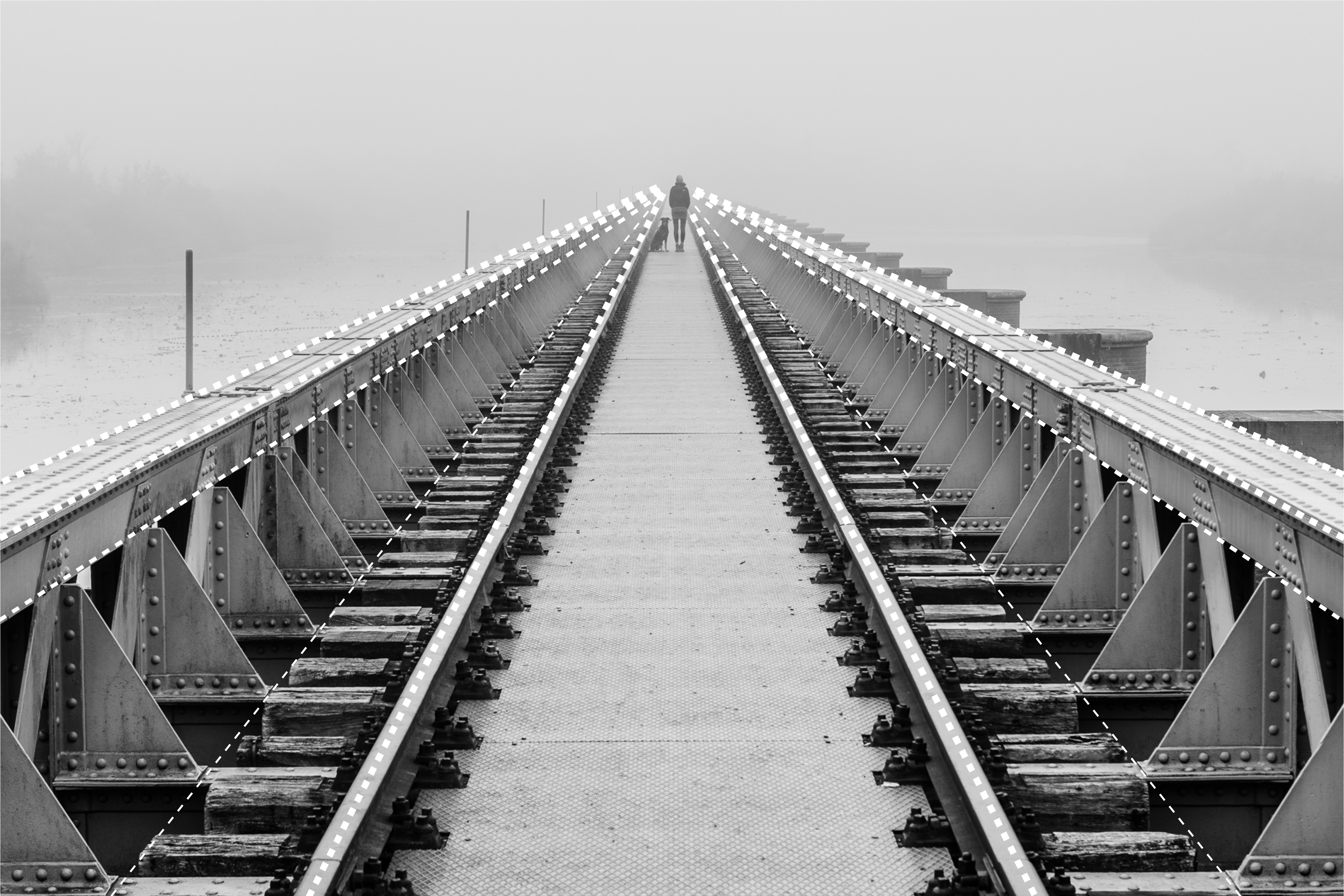 De lijnen van de brug en oude spoorrails brengt je aandacht automatisch naar het einde waar ik samen met mijn hond JJ sta. Door te fotograferen in de mist zie je het eind van de brug niet, dat geeft de foto een bijzondere sfeer.