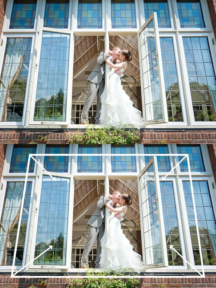 De foto hieronder heeft ook een vierkant kader, als is deze minder duidelijk. Het bruidspaar staat in het openstaande raam en door het frame wat hierdoor ontstaat om hen heen (en de lichtere achtergrond achter hen), krijgen zij direct alle aandacht in de foto.