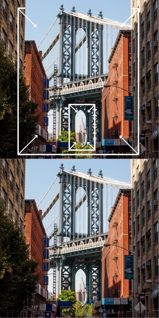 Soms is er zelfs sprake van een kader in een kader in een kader, zoals je kunt zien bij de foto hieronder. De gebouwen aan de zijkant vormen een duidelijk kader voor de brug, en de brug vormt weer een kader om het Empire State Building!