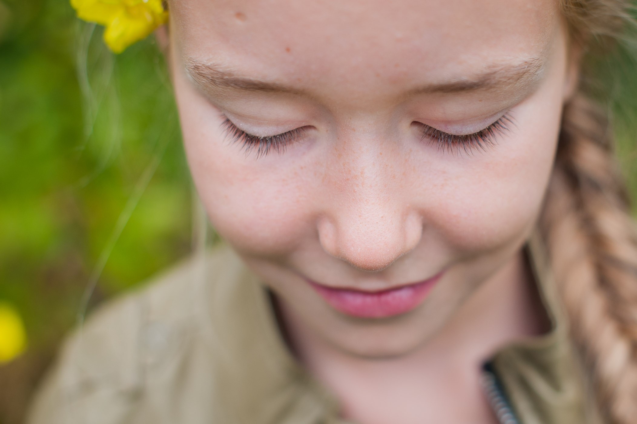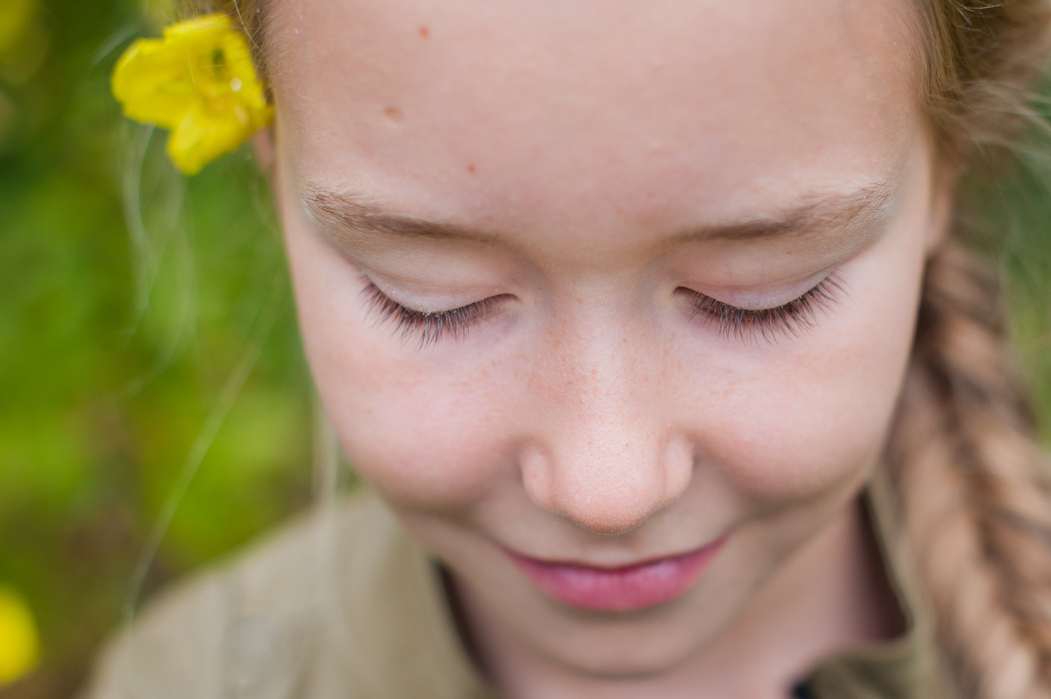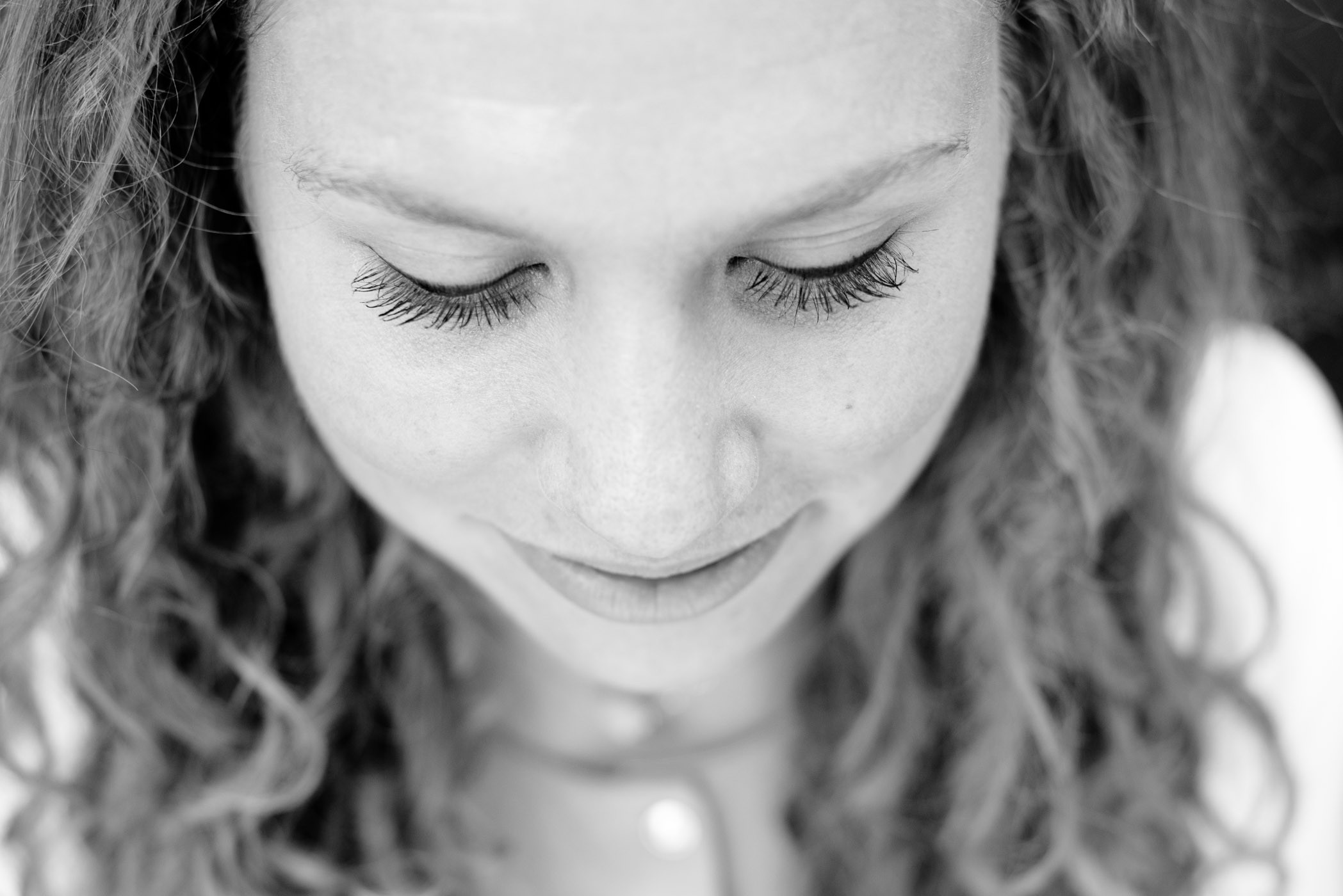 Bij portretfotografie stel je gewoonlijk scherp op de ogen, maar in deze situatie kies je voor de wimpers. Gebruik hiervoor de scherpstelpunten en zet deze op de juiste plek. Als instellingen kies je een groot diafragma, zodat je weinig scherptediepte in de foto krijgt. Let op dat het scherpstellen nu heel nauw komt: een kleine beweging van jou of de ander en de focus ligt niet meer op de wimpers. Bij alle foto’s op deze pagina gebruikte ik het vaakst een diafragma van f/2.8 (soms f/2.5, soms 3.2)